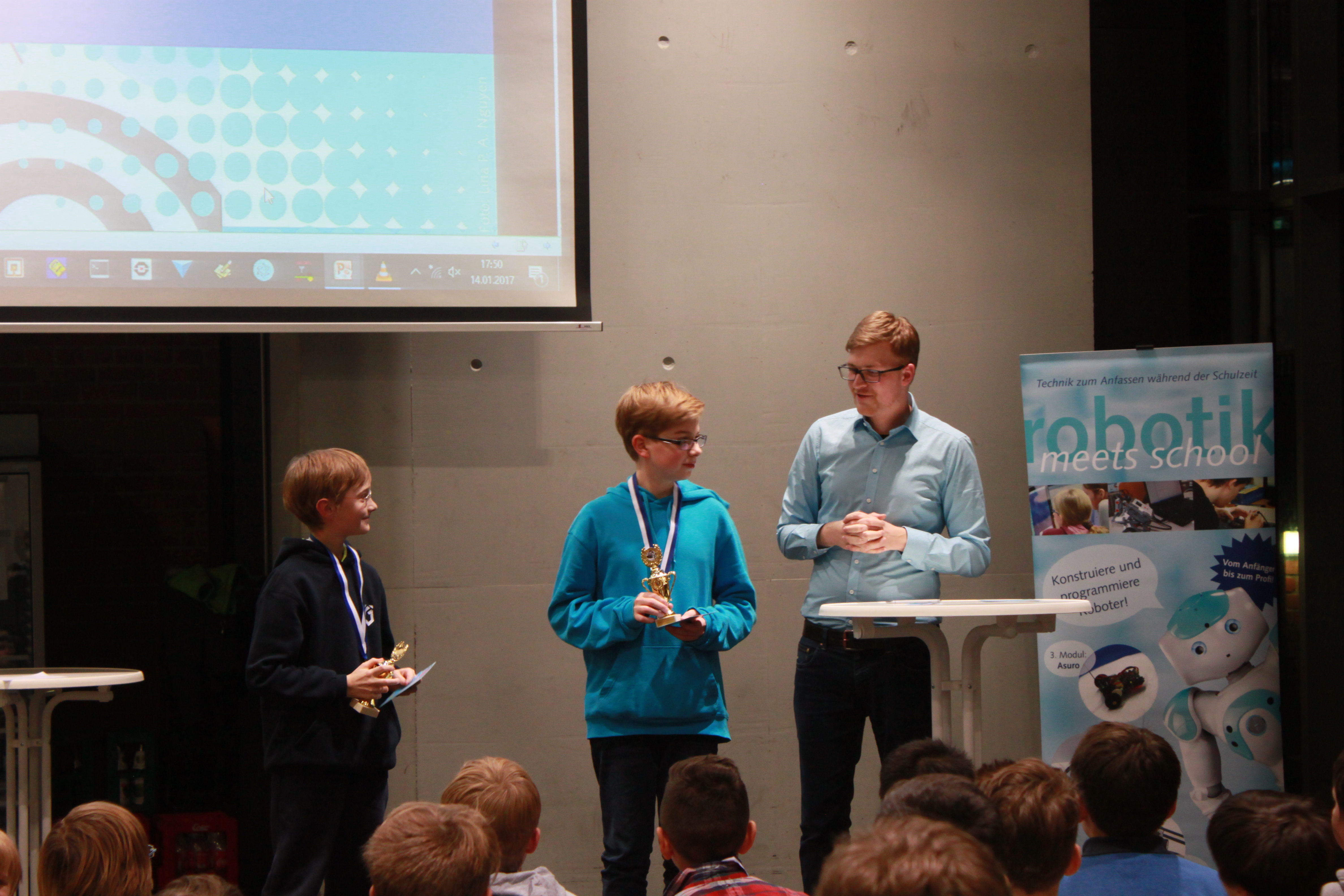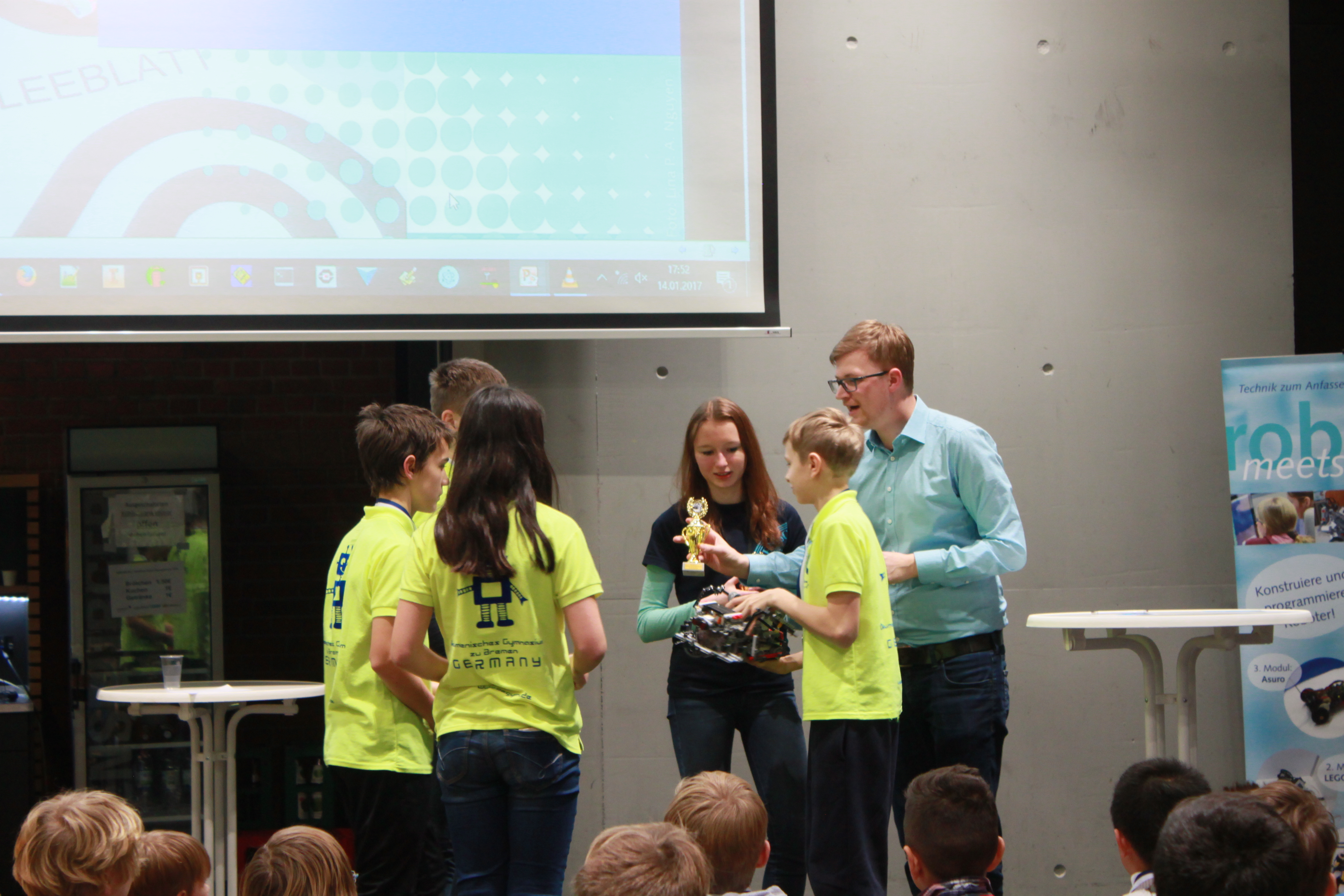 Zum Schluss wurde die Siegerehrung mit Spannung erwartet. Die finalen Punktzahlen waren den Teams noch nicht bekannt und die Aufregung war groß. Alle Teilnehmer erhielten Urkunden, einen Gutschein für den Technikclub „nordbord“ sowie eine Erinnerungs-Medaille. Die ersten drei Sieger wurden zusätzlich mit Pokalen geehrt. Für besonders gute Programmierleistungen und die beste Konstruktion des Roboters wurden außerdem zwei Sonderpreise verteilt.
