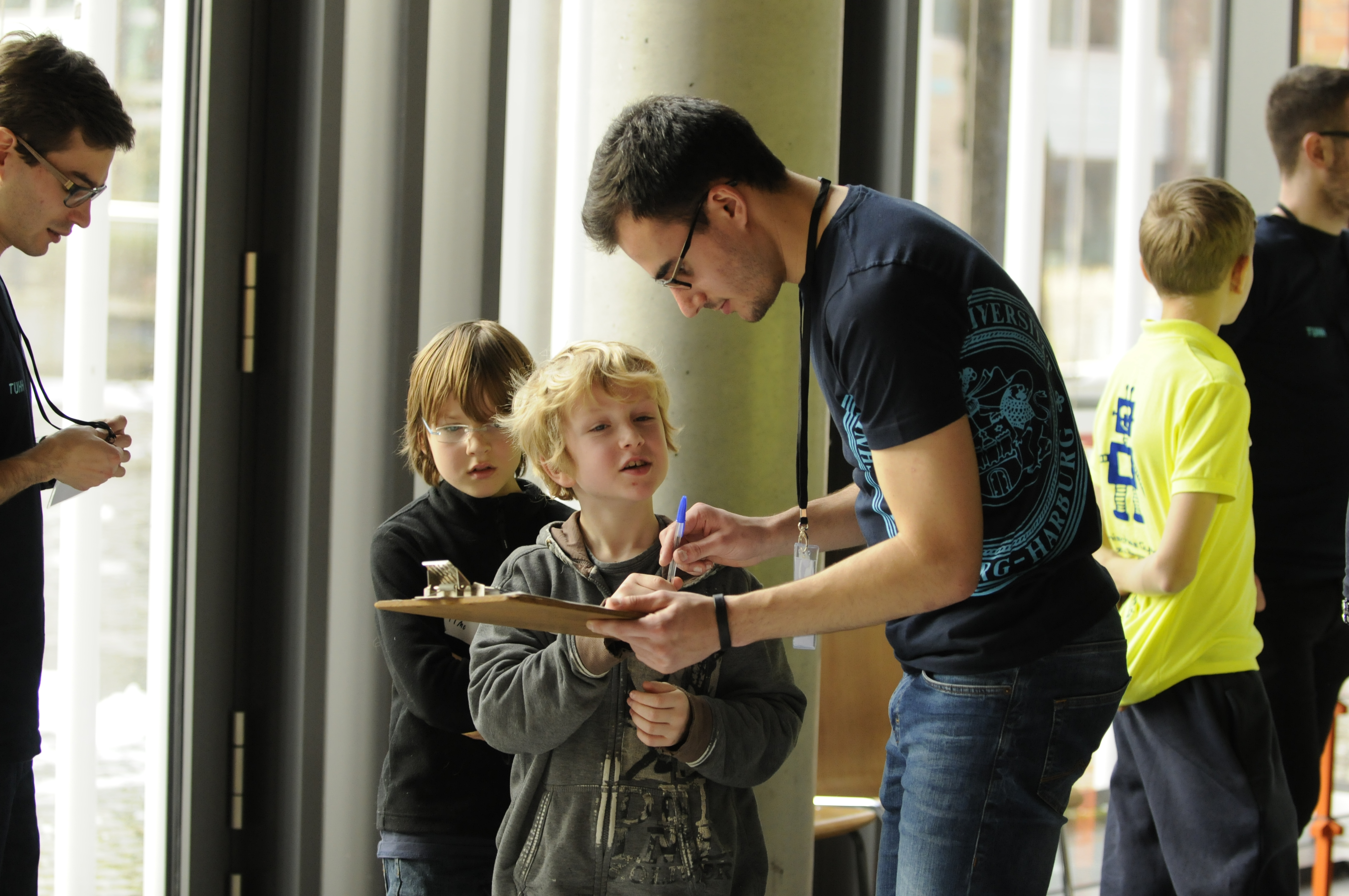 Die Atmosphäre war konzentriert und angespannt zugleich - 39 Schülerinnen und Schüler im Alter von neun bis fünfzehn Jahren traten in 16 Teams gegeneinander an. Viele Teilnehmer kamen aus von dem Projekt robotik@TUHH angebotenen Robotik- und Technikkursen an Schulen in und um Hamburg. In den Kursen wurden die Aufgaben des RoboCups Junior Rescue behandelt und mögliche Lösungen entwickelt. Wie bereits im letzten Jahr stellte zudem das Ökumenische Gymnasium zu Bremen mit 15 Teilnehmern mehrere Teams.