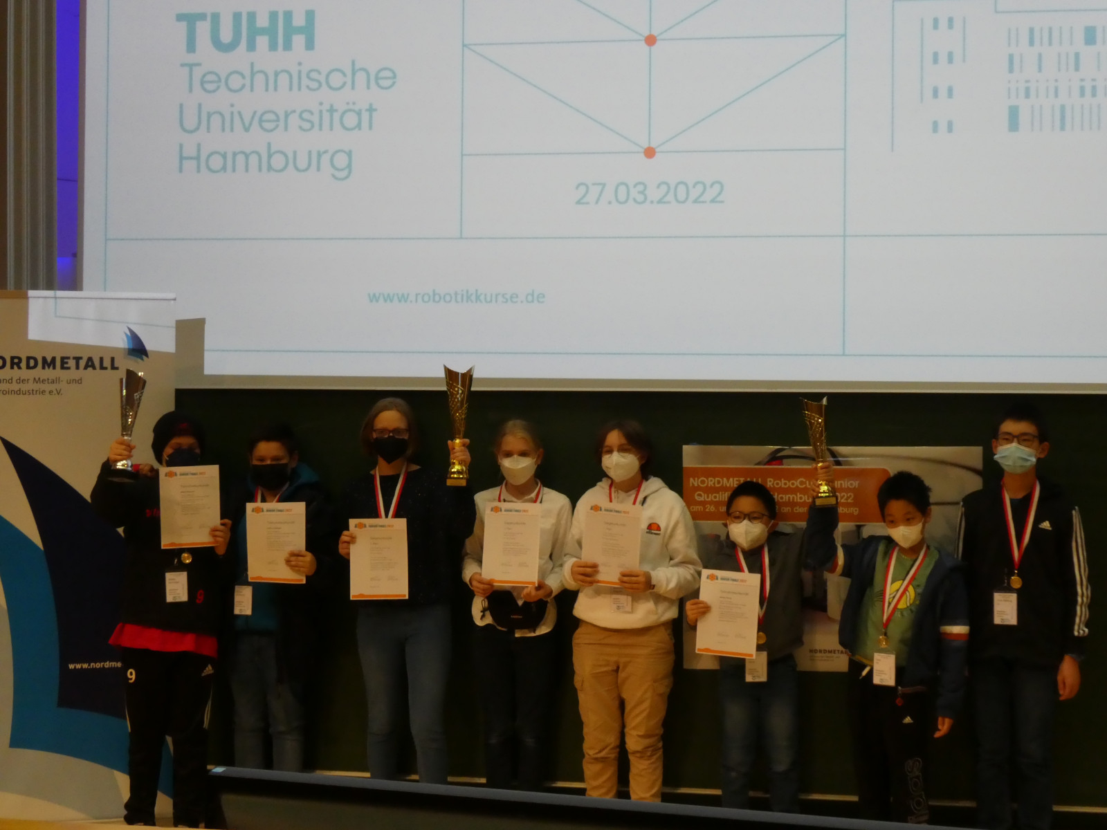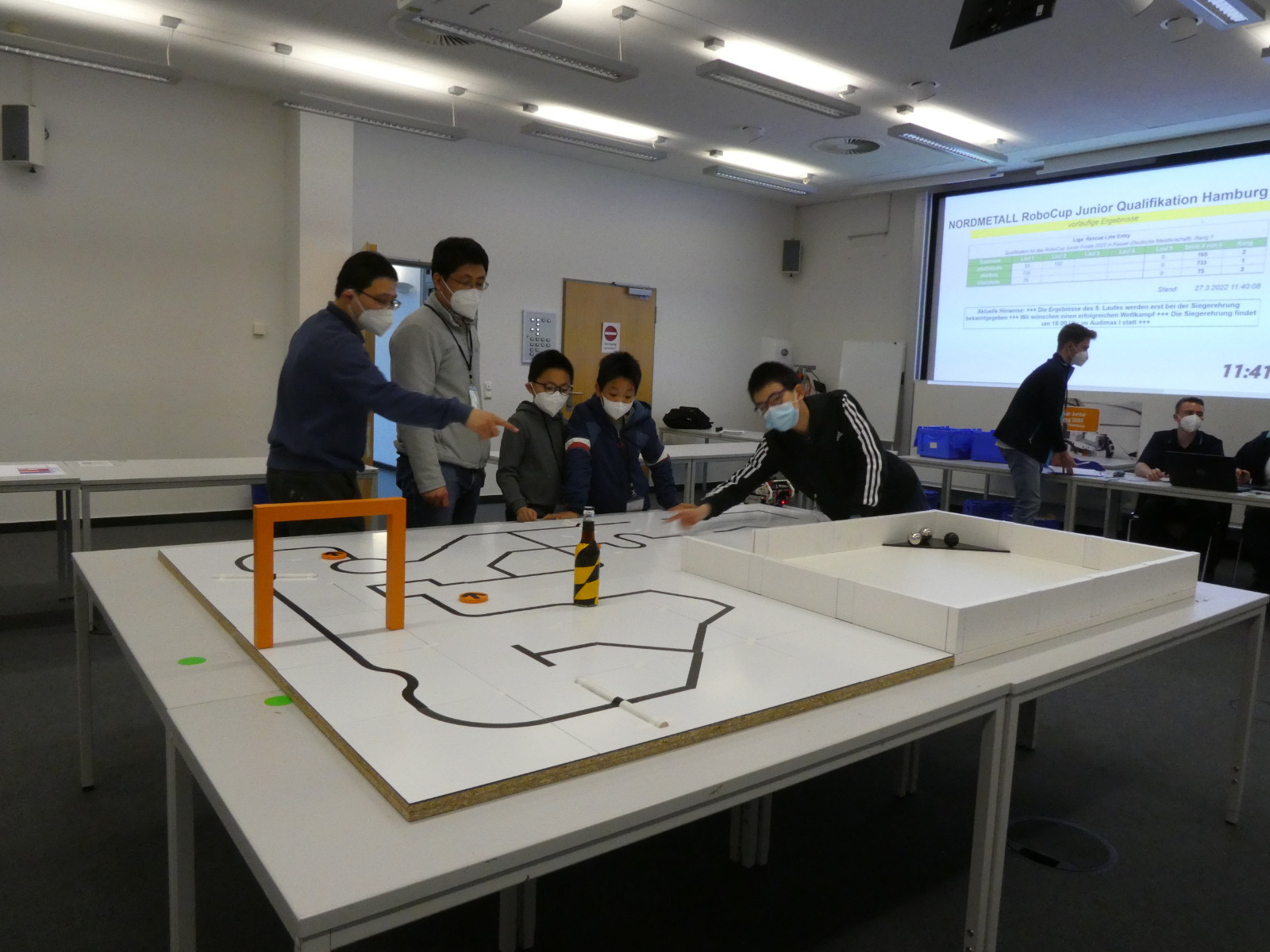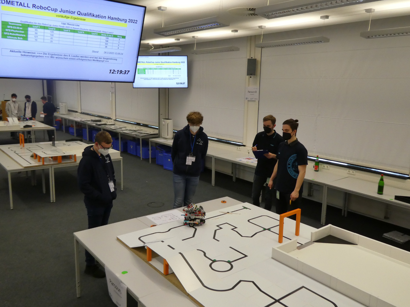Nach anderthalb Jahren pandemiebedingter Pause fand am 26. und 27. März die jährliche NORDMETALL RoboCup Junior Qualifikation Hamburg 2022 an der Technischen Universität Hamburg statt. Nachdem in den letzten Monaten viele Veranstaltungen abgesagt werden mussten, oder nur virtuell stattfinden konnten, freuten sich die 22 Teilnehmer aus sieben Teams besonders darauf, sich persönlich zu treffen und im Rahmen der Veranstaltung das Können ihrer Roboter zu präsentieren. Der RoboCup ist der führende und größte Wettbewerb für intelligente Roboter und damit eines der weltweit bedeutendsten Technologie-Events. In diesem Jahr gibt es deutschlandweit an acht verschiedenen Standorten Qualifikationstuniere, unter anderem in Hannover, Mannheim, Berlin und Kassel. Die Idee, dass auch die TU Hamburg sich als ein Standort für die wichtige Qualifikation etabliert, entstand aus dem Projekt robotik@TUHH. Mit diesem Projekt engagieren sich Vertreter der Wirtschaft und die Technische Universität bereits seit 2003 gezielt in der MINT Förderung.