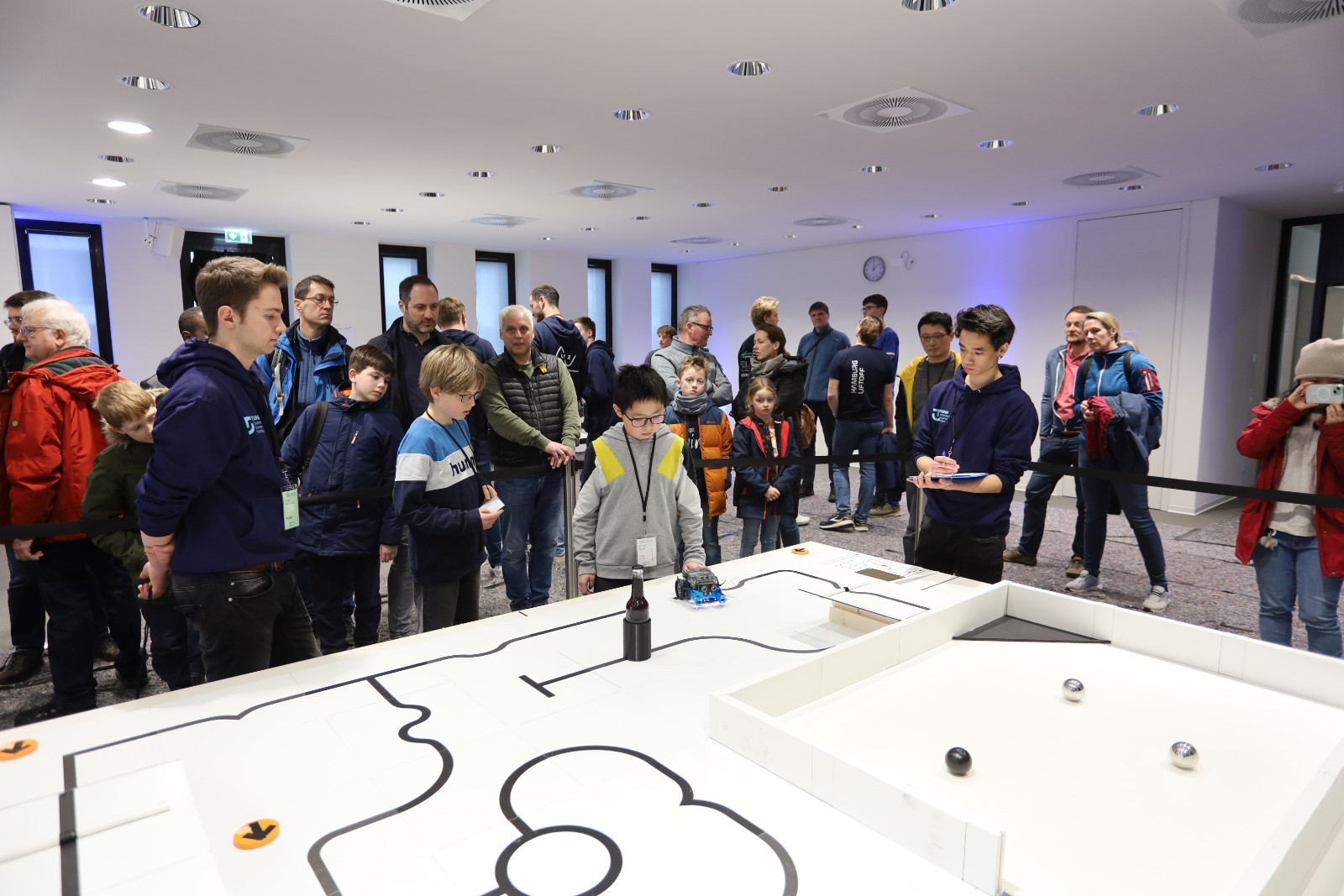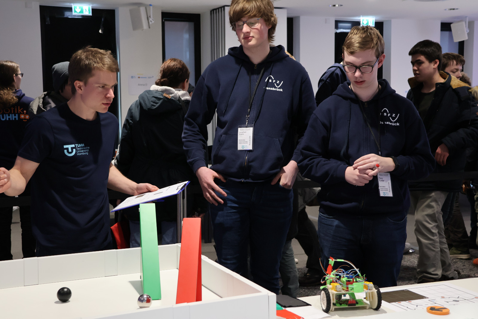 Am vergangenen Wochenende war es wieder soweit: 98 Teilnehmerinnen und Teilnehmer des RoboCup Junior fieberten dem Wettkampf und der Qualifikation für die deutschen Meisterschaften entgegen. Bereits zum sechsten Mal ist die Technische Universität Hamburg Ausrichterin von einem der insgesamt acht Qualifikationsturniere. 35 Teams aus ganz Norddeutschland hatten sich monatelang auf den Termin in Hamburg vorbereitet und präsentierten ihre selbstkonstruierten Roboter der Fachjury. In drei unterschiedlichen Disziplinen hoffte jedes Team auf das begehrte Ticket für die deutsche Meisterschaft, die vom 17. bis 21. April in Kassel stattfindet.