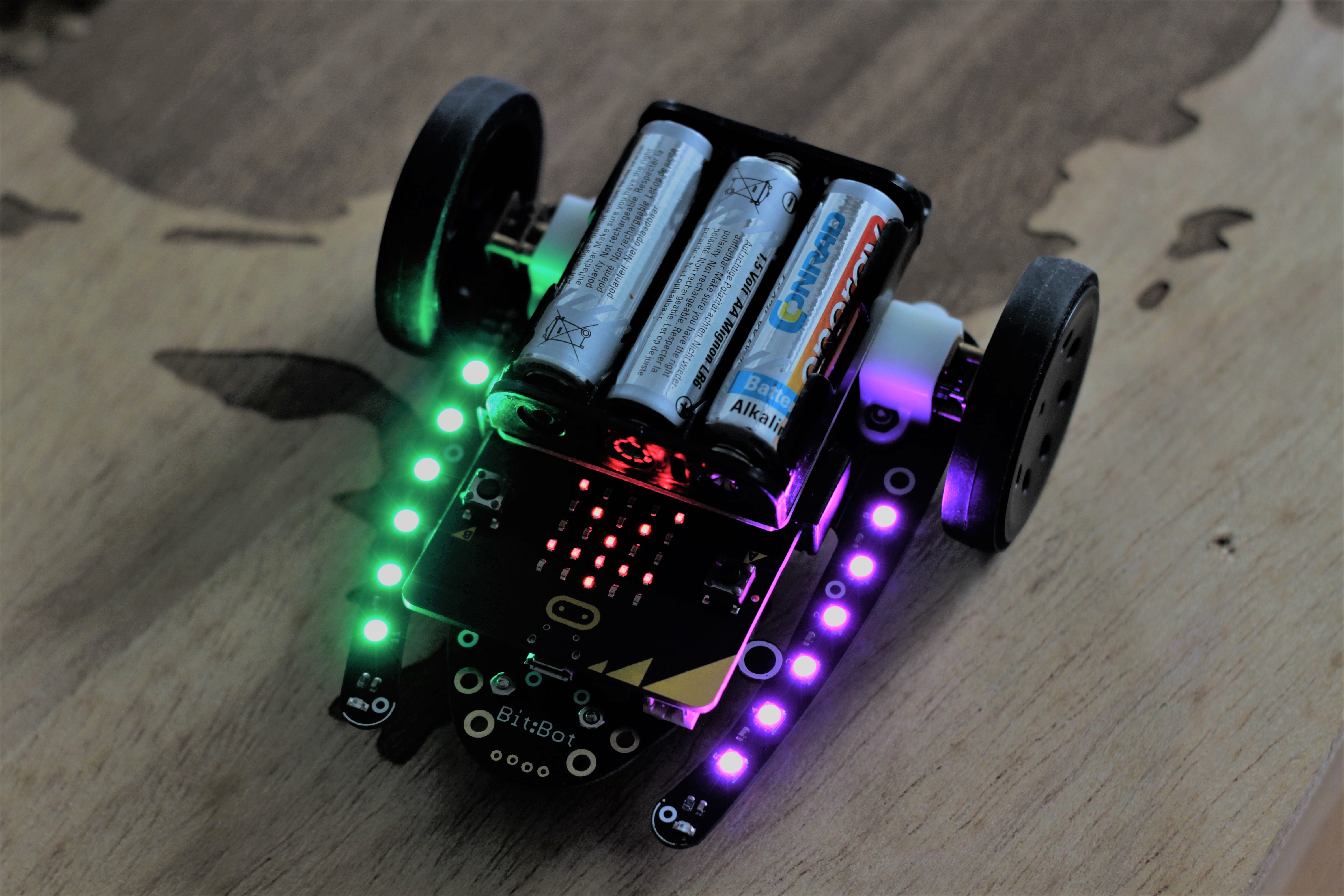 Der micro:bit ist ein Mikrocontroller mit einer 5x5 Matrix, der mithilfe des Bit:Bots zu einem kleinen fahrenden Roboter wird und mit MicroPython programmiert wird